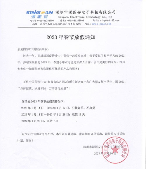 深國安2023年春節放假安排如下:放假時間:2023年1月18日-2023年1月28日,共放假11天(2023年1月29日初八正常上班)(放假期間正常接單,統一年后安排生產與發貨!)正值春節來臨...