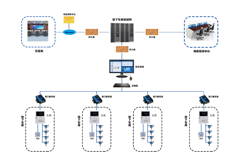 3.接著氣體檢測儀監(jiān)測到一氧化碳氣體時,氣體控制器用于發(fā)出報警信號并開啟風機,串口服務器接收控制器發(fā)出的報警信號并回傳至軟件系統(tǒng),軟件系統(tǒng)收到報警信號后,通過地下車庫局域網把報警信息和數據傳輸至安監(jiān)局和調度指揮中心,安監(jiān)局通過網絡以短信的方式把一氧化碳監(jiān)測信息發(fā)送到移動平臺。